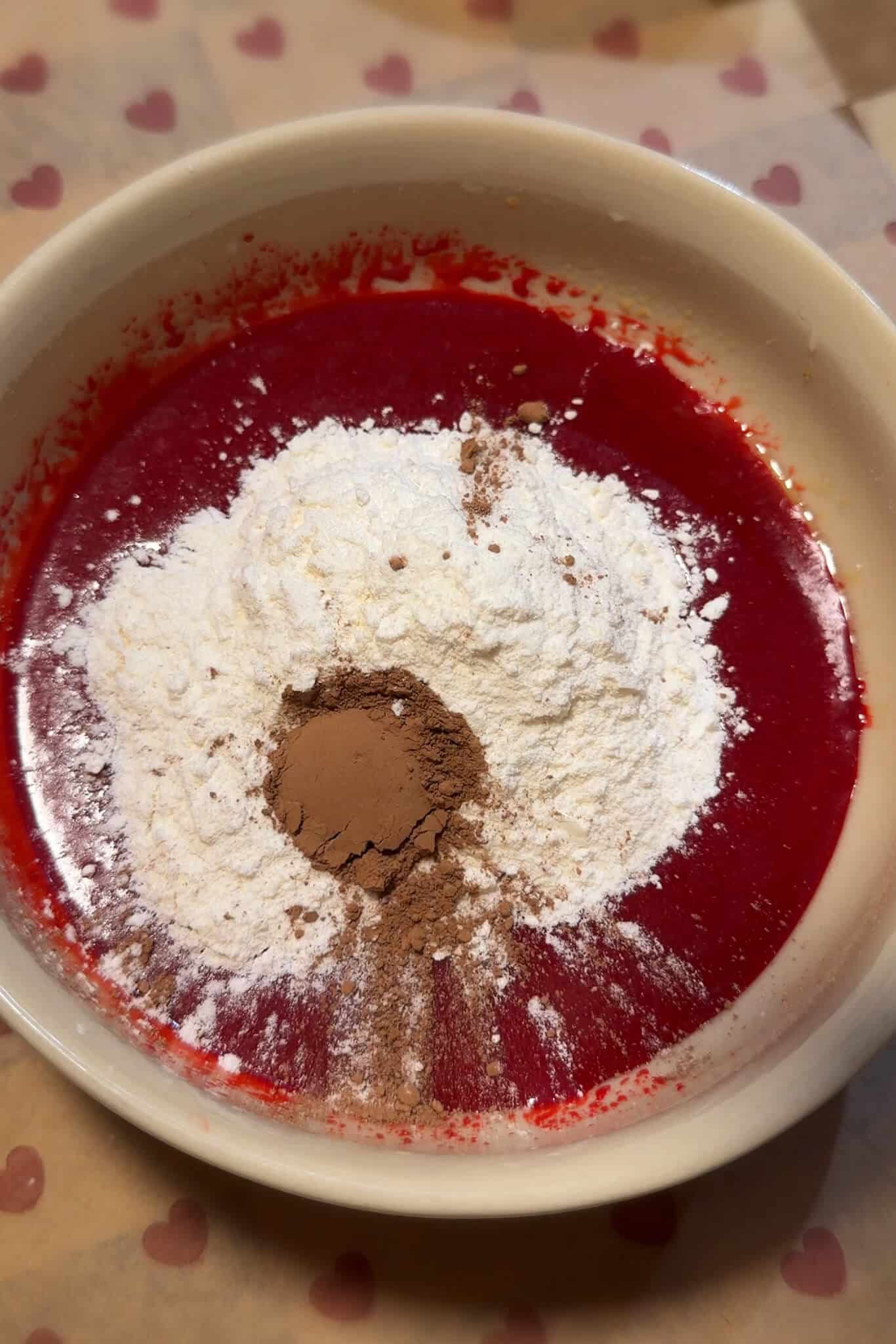 - Whisk together brown sugar, condensed milk, milk, vanilla red food colour, vinegar and cooled brown butter until well combined.