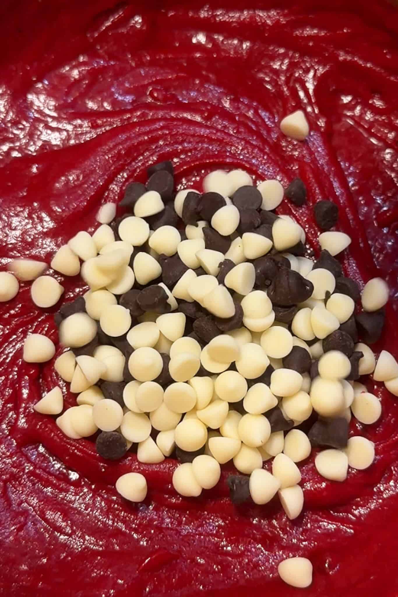 - Fold in all purpose flour, cornstarch, cocoa powder and baking soda, don't overmix. Fold in the dark and white chocolate chips gently.