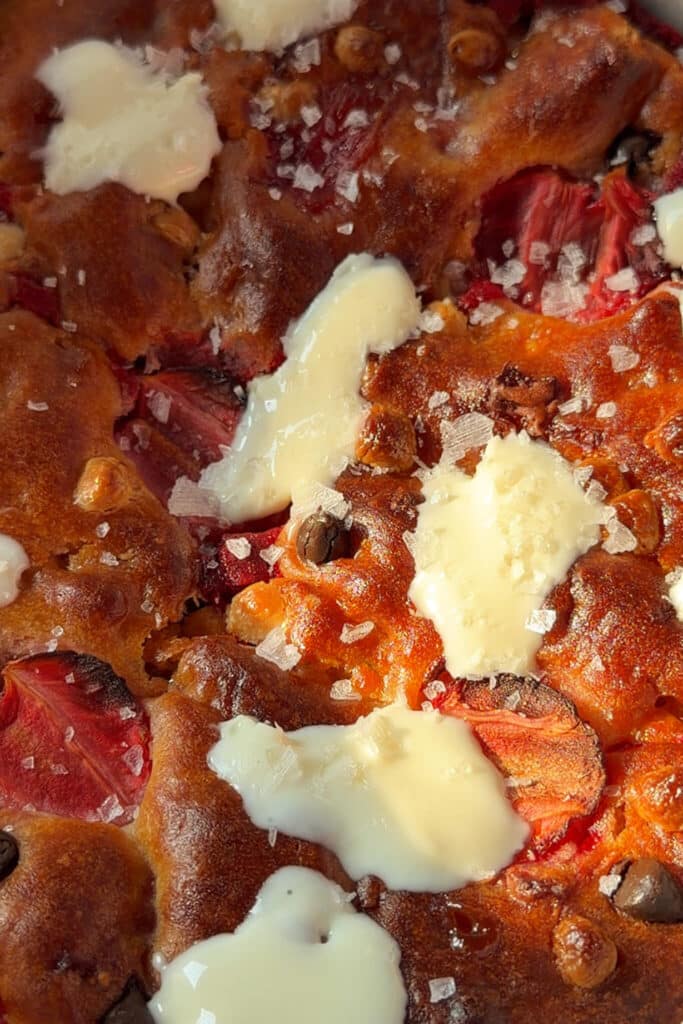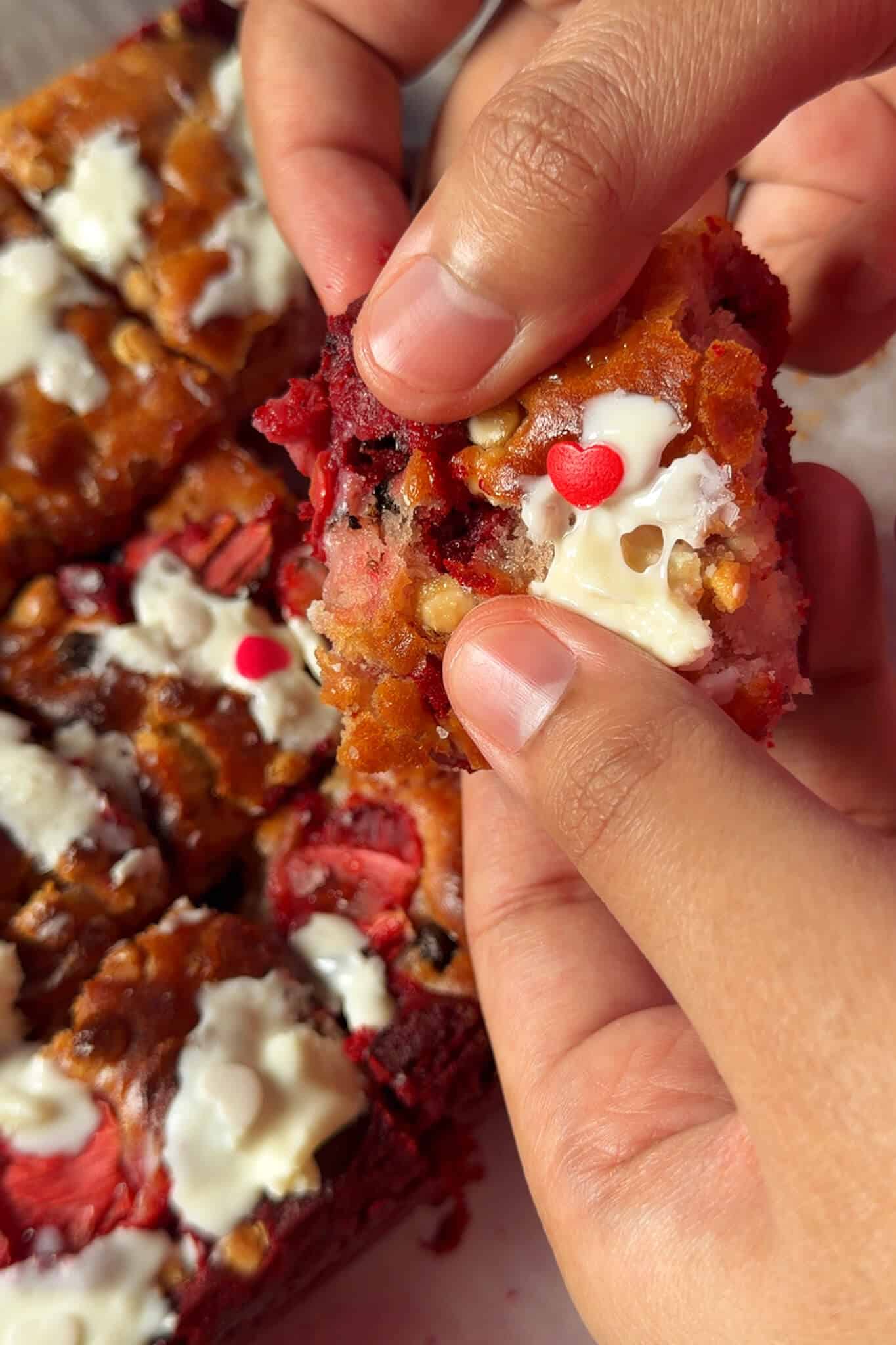 - Time to assemble: Transfer the cookie dough and the brownie batter to a greased, parchment lined baking tin. Using a cookie scooper or spoon, add alternating scoops of cookie dough and brownie batter to create a layered effect and smoothen the top. Top with white and dark chocolate chips and fresh strawberries.