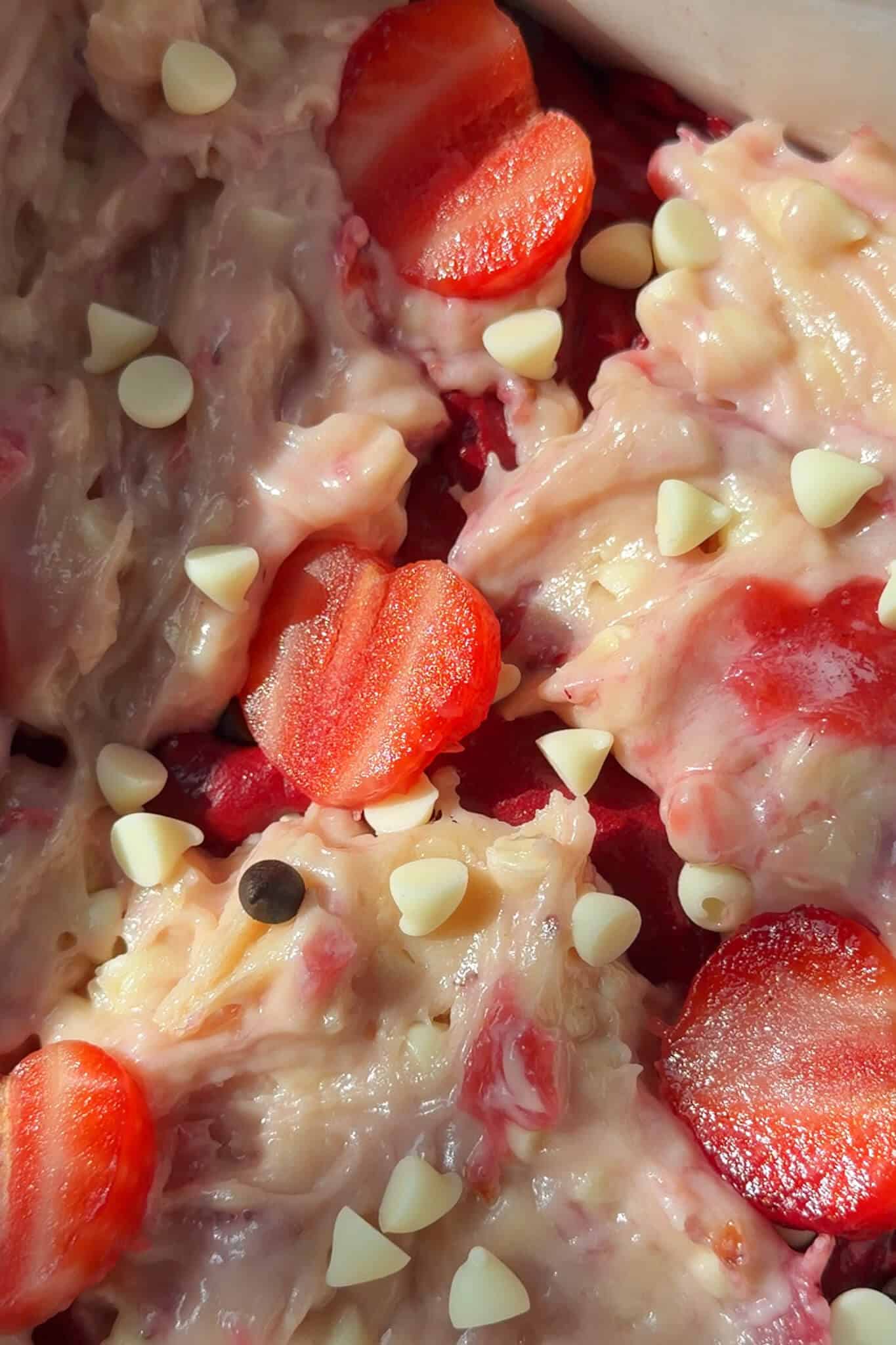 - Add chocolate and strawberry compote: Fold in the chocolate chips and strawberry compote with a spatula.
