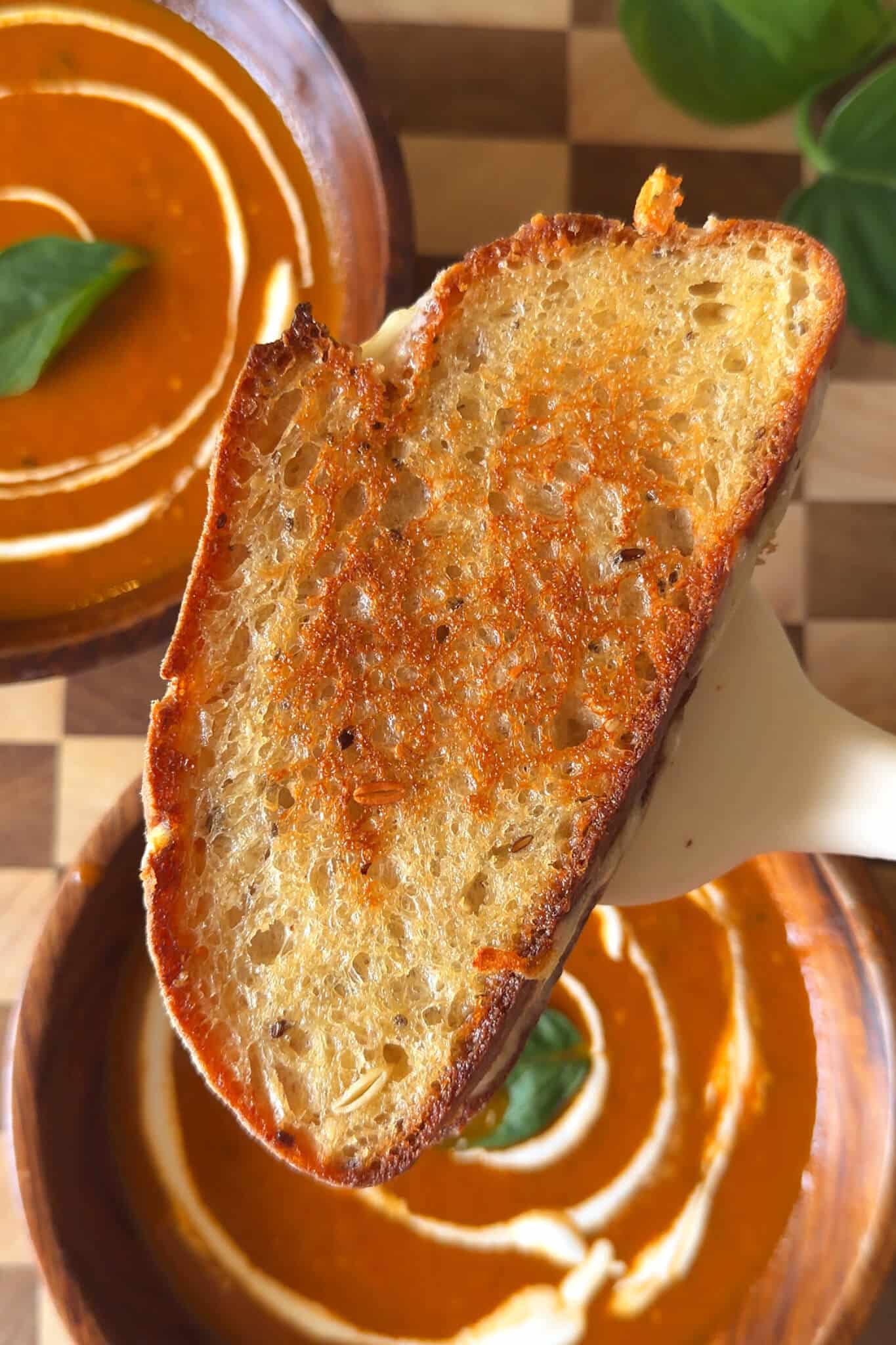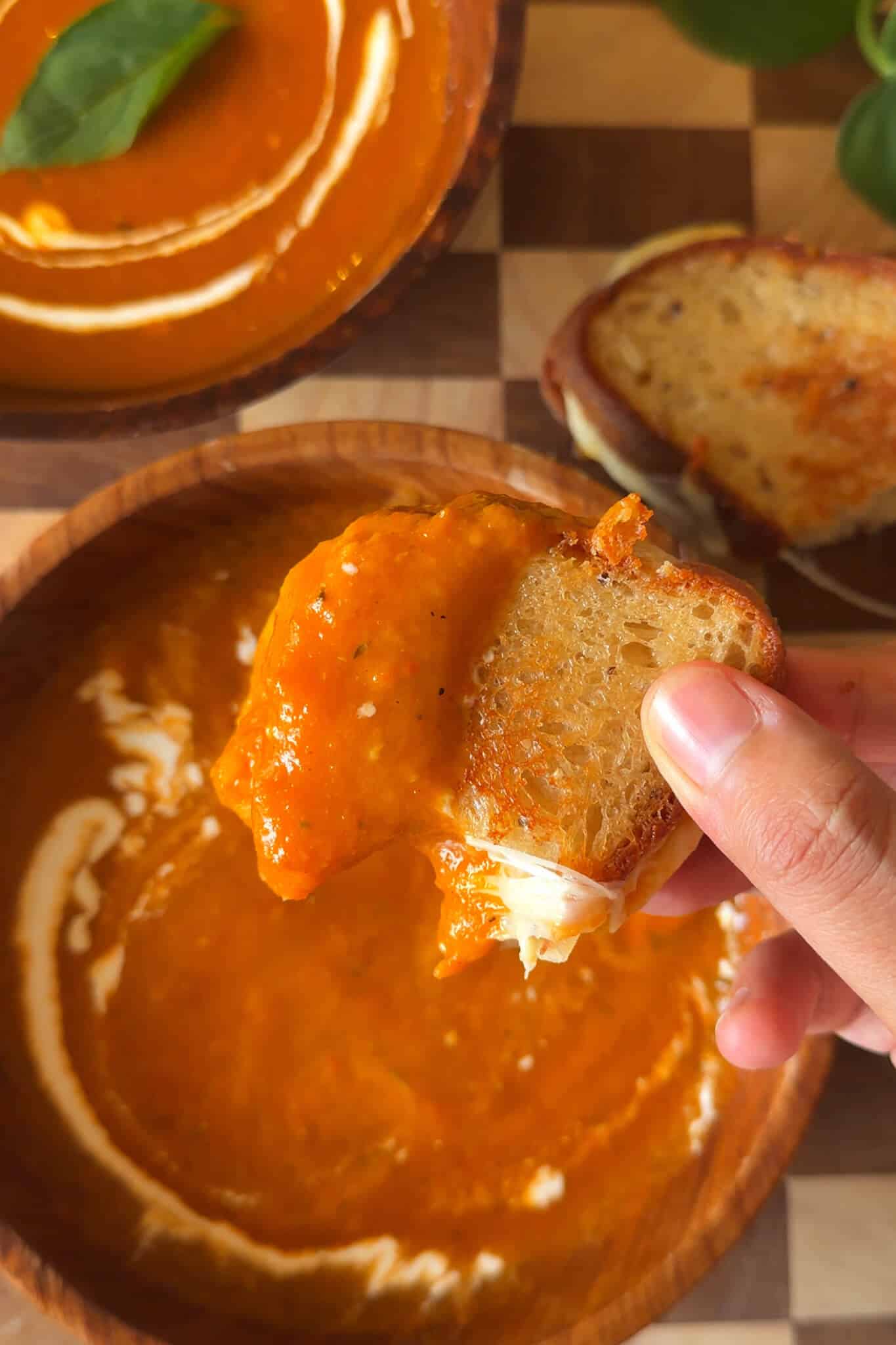 - Pour the hot soup into a bowl, add a swirl of fresh cream and a basil leaf and serve it hot with buttery grilled cheese on the side, enjoyy!