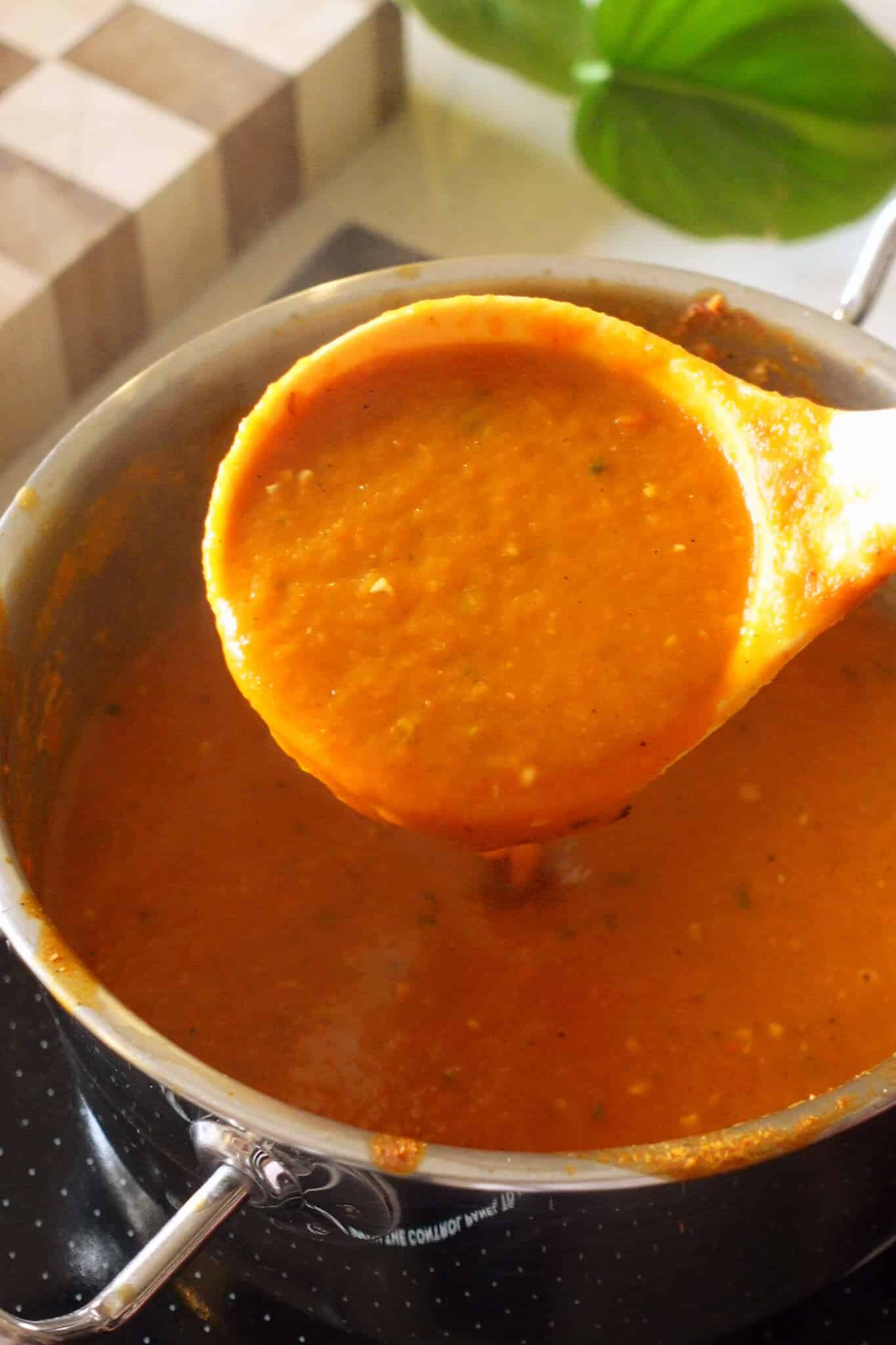 - Transfer the blended soup to a pot, adjust the consistency with more water if needed and season with onion powder, garlic powder, a touch of sweetener (I use monkfruit sweetener but you can use honey, ketchup or brown sugar), more salt if required, oregano and garlic bread seasoning. Cook this for 5 to 10 minutes till the soup thickens to your liking.