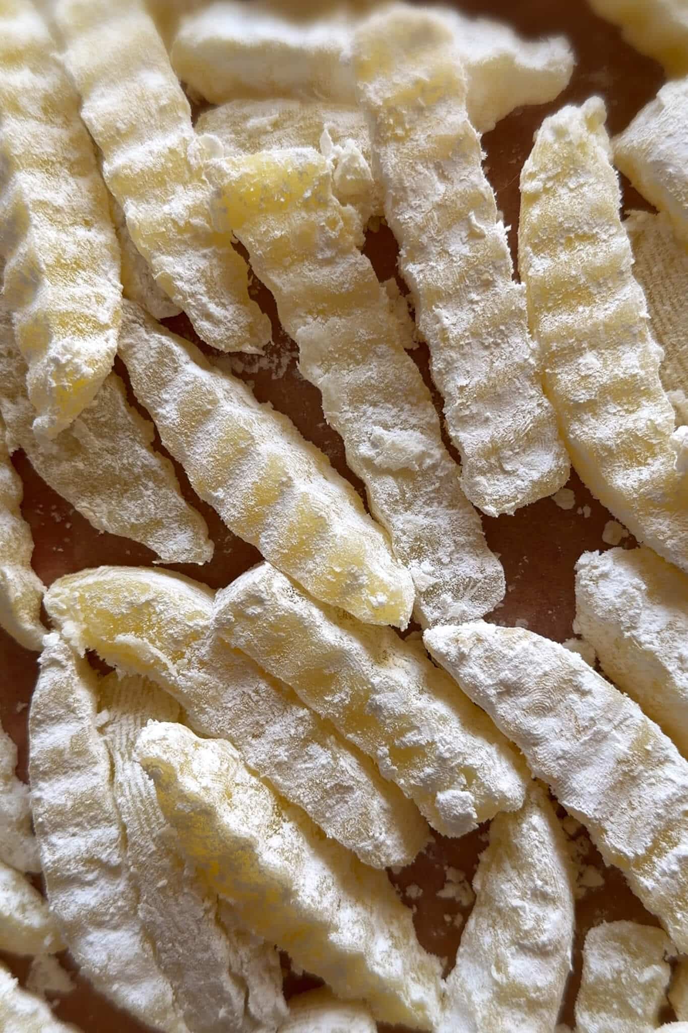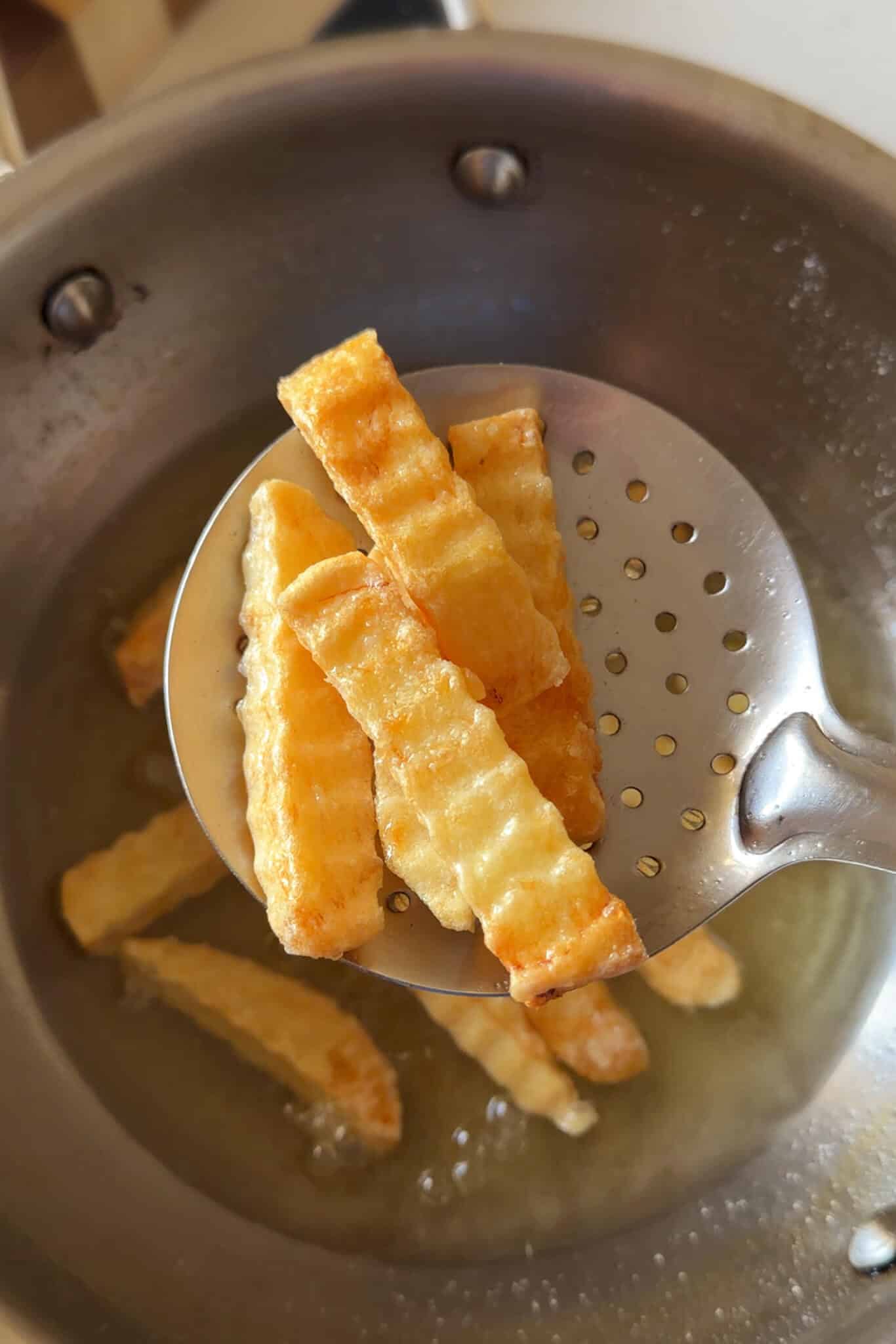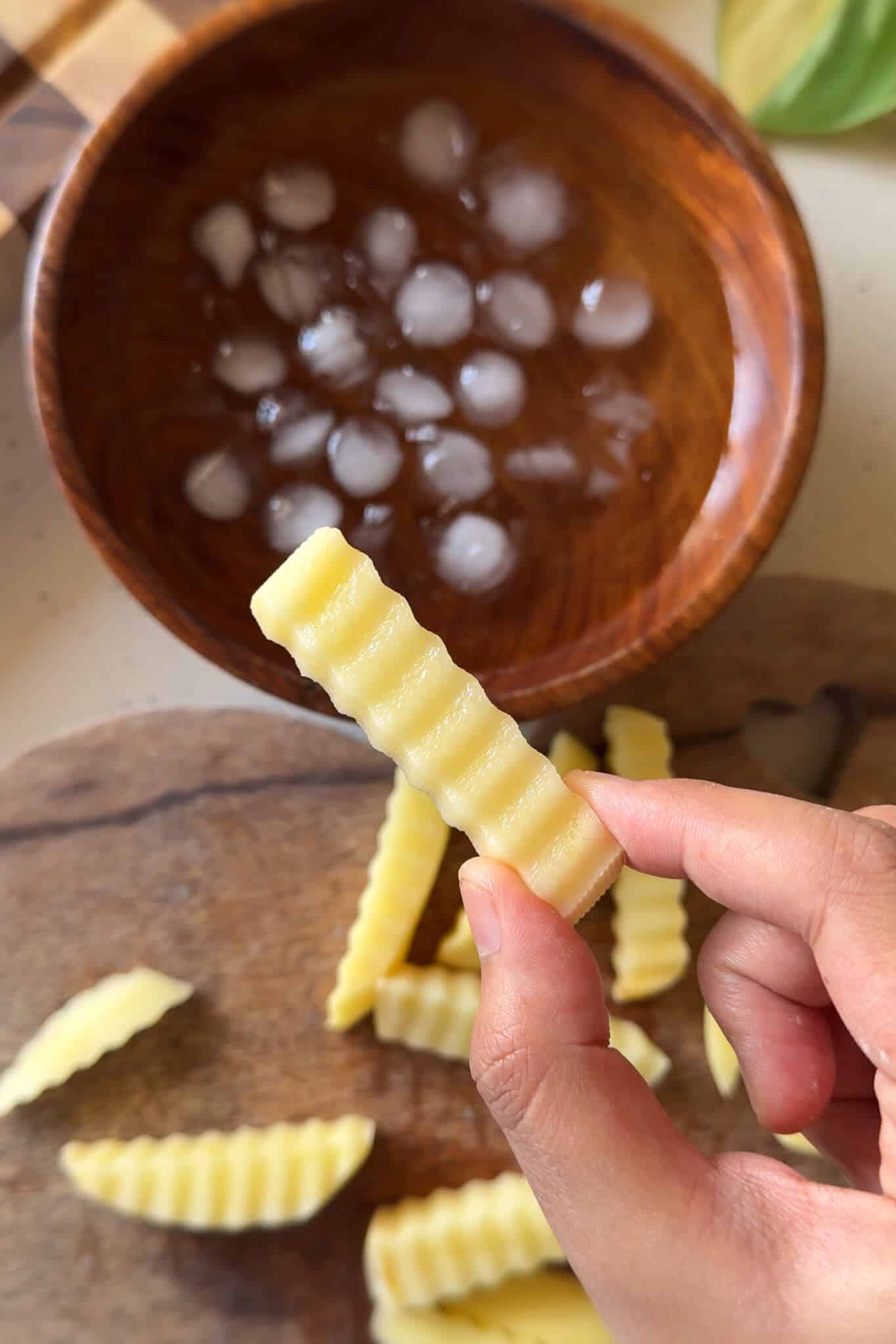 - Peel the potatoes and cut them using a regular knife or a crinkle cutter, depending on the shape you prefer. I went with a crinkle cut for extra texture.