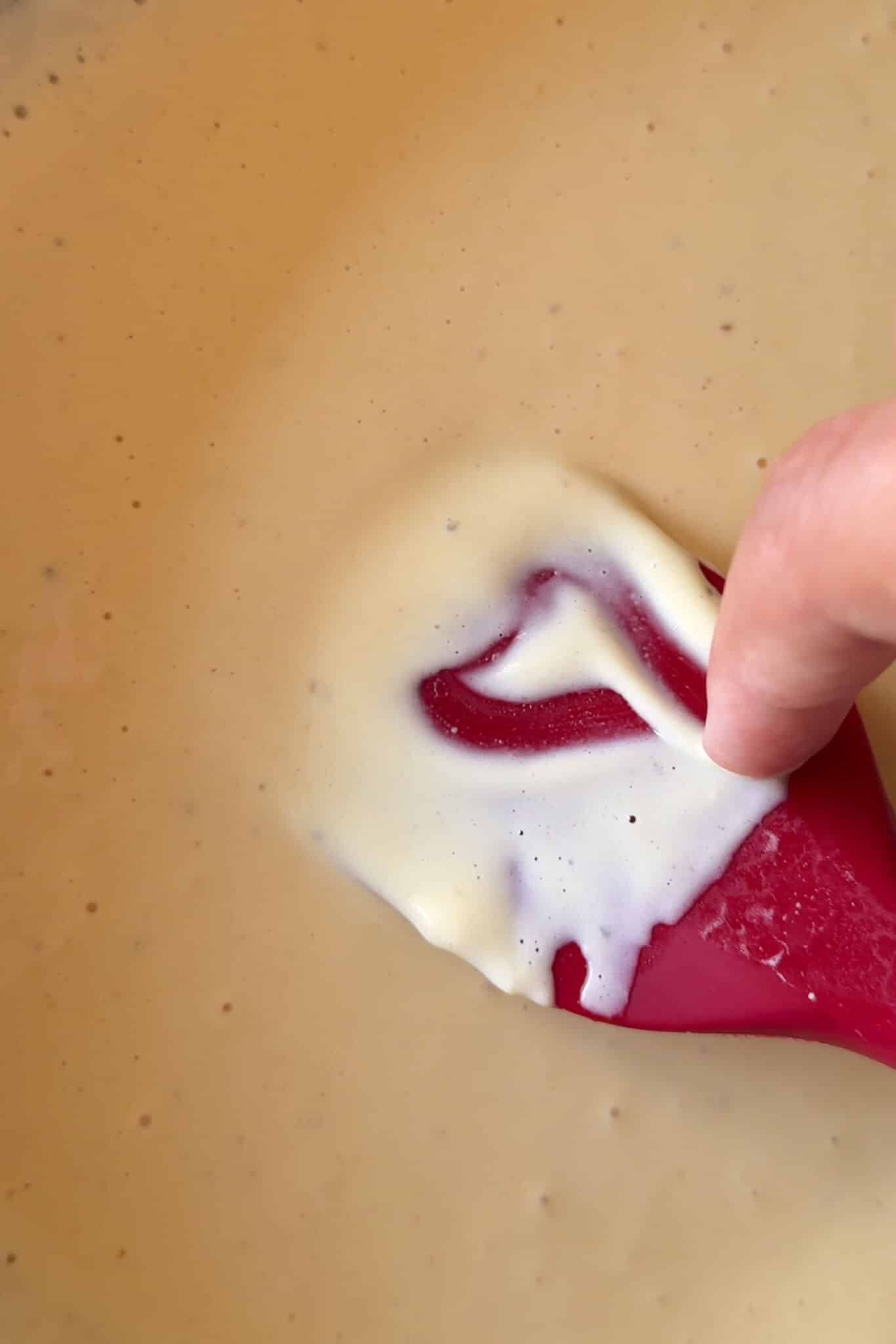 - Cook on very low heat, mixing continuously until smooth and thickened into a glossy cheese sauce. Do not increase the heat or the mixture may split. Serve the fries with the cooled (or warm) cheese sauce and enjoyy!
