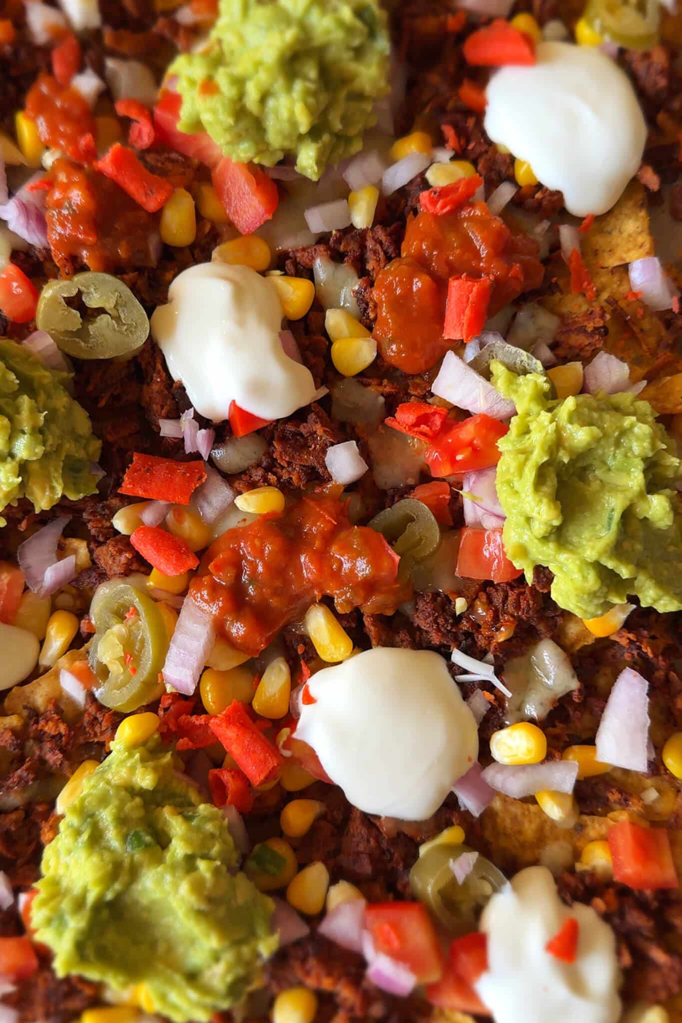 These sheet pan loaded nachos come together with the perfect mix of textures and flavours and everything is genuinely so easy to make. The base is jalapeño nachos that stay crisp even after baking, topped with a spiced tomato tofu that’s savoury, smoky and full of flavour. The guacamole adds creaminess and freshness, the sweet corn brings a little pop and the cheddar melts into all the gaps so every bite feels loaded. Once it comes out of the oven, the fresh tomatoes and onions add that crunchy bite, the sour cream and salsa balance all the heat and the crushed doritos on top give the perfect finishing crunch. It’s all made with simple steps, minimal prep and everything bakes on one tray which makes this the easiest, most satisfying nacho situation you can pull together at home.