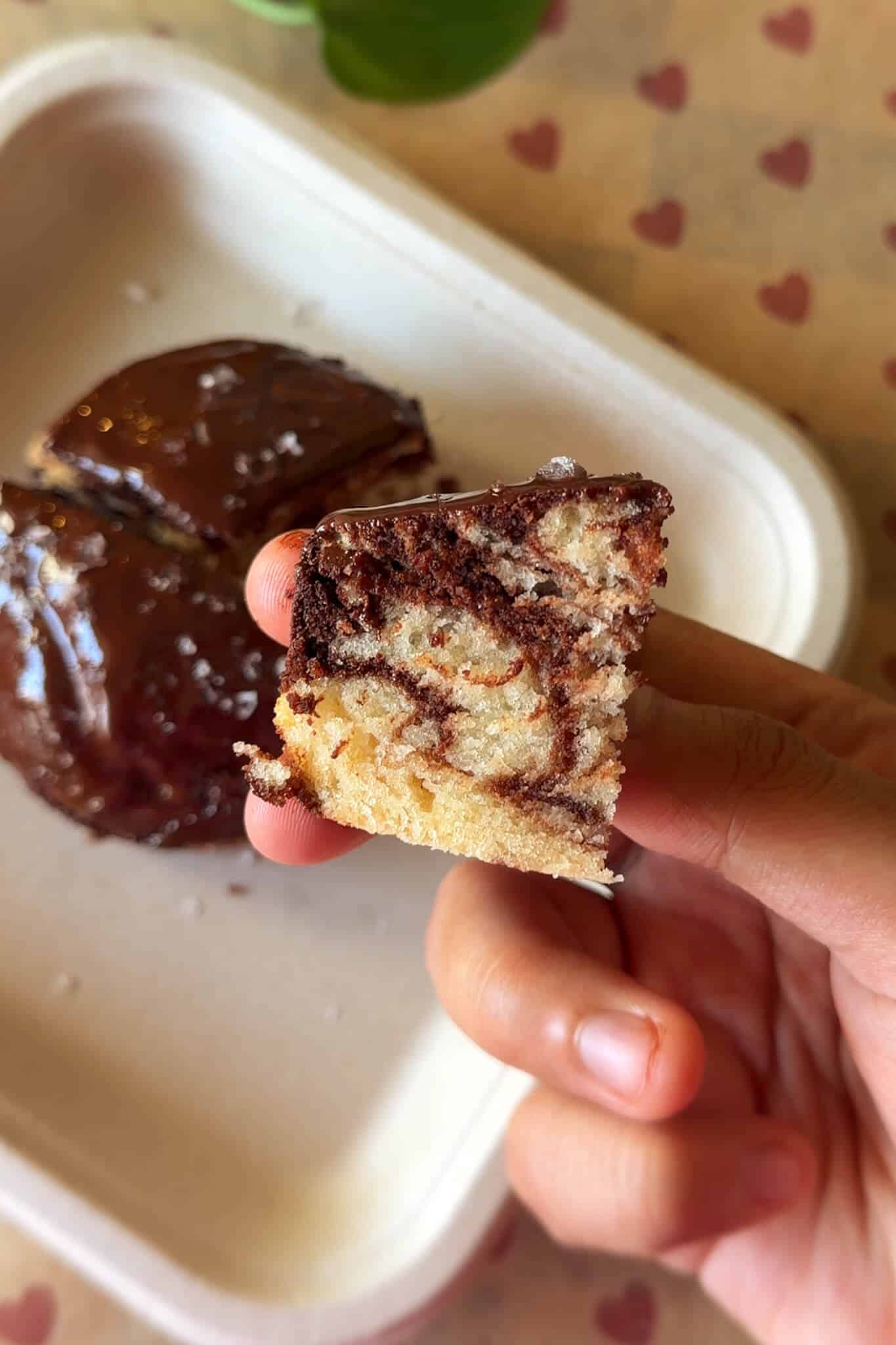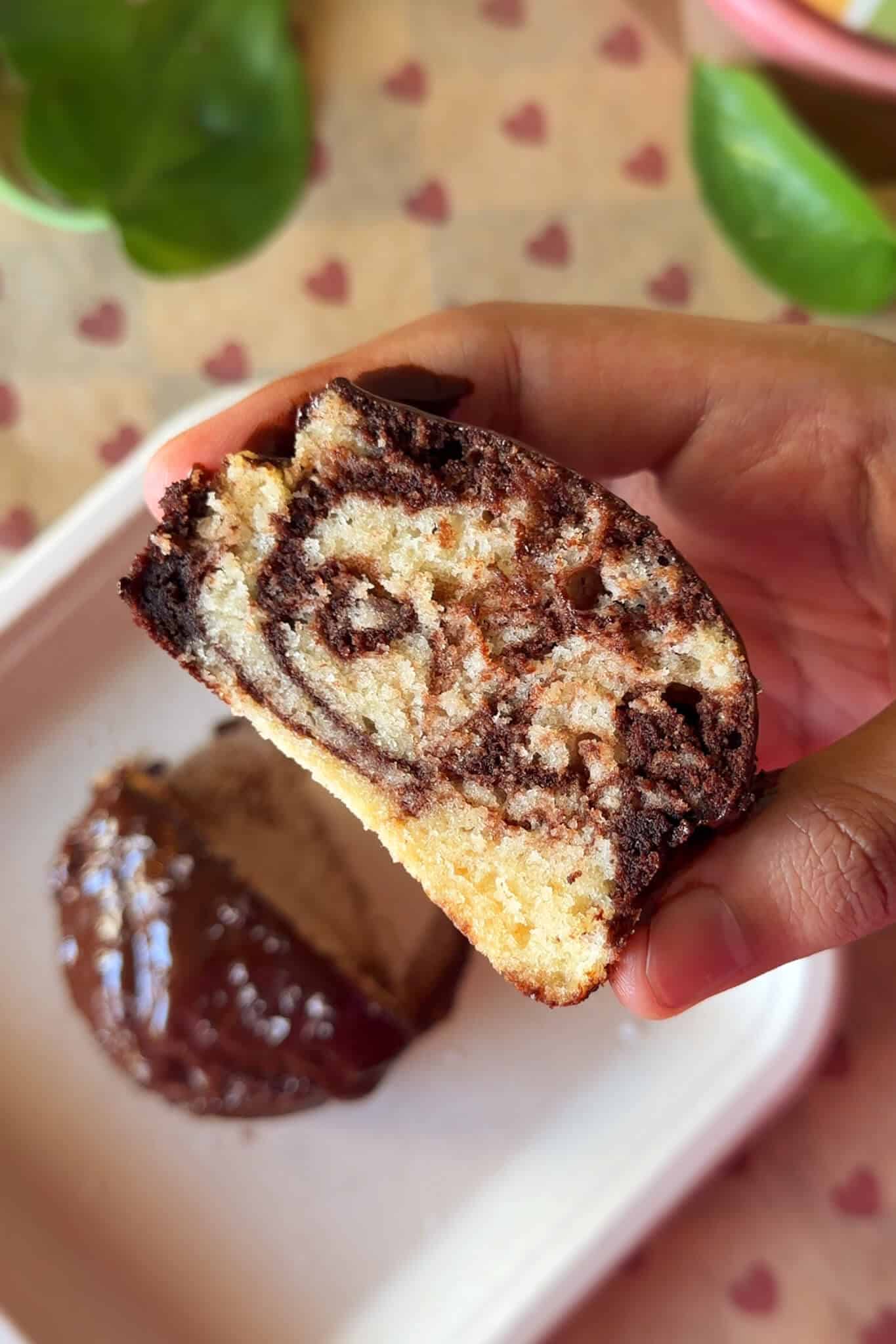 - Finish with chocolate: Dip the top of the cooled cake in melted chocolate and sprinkle some flaky salt. Your mini marble cake is ready.