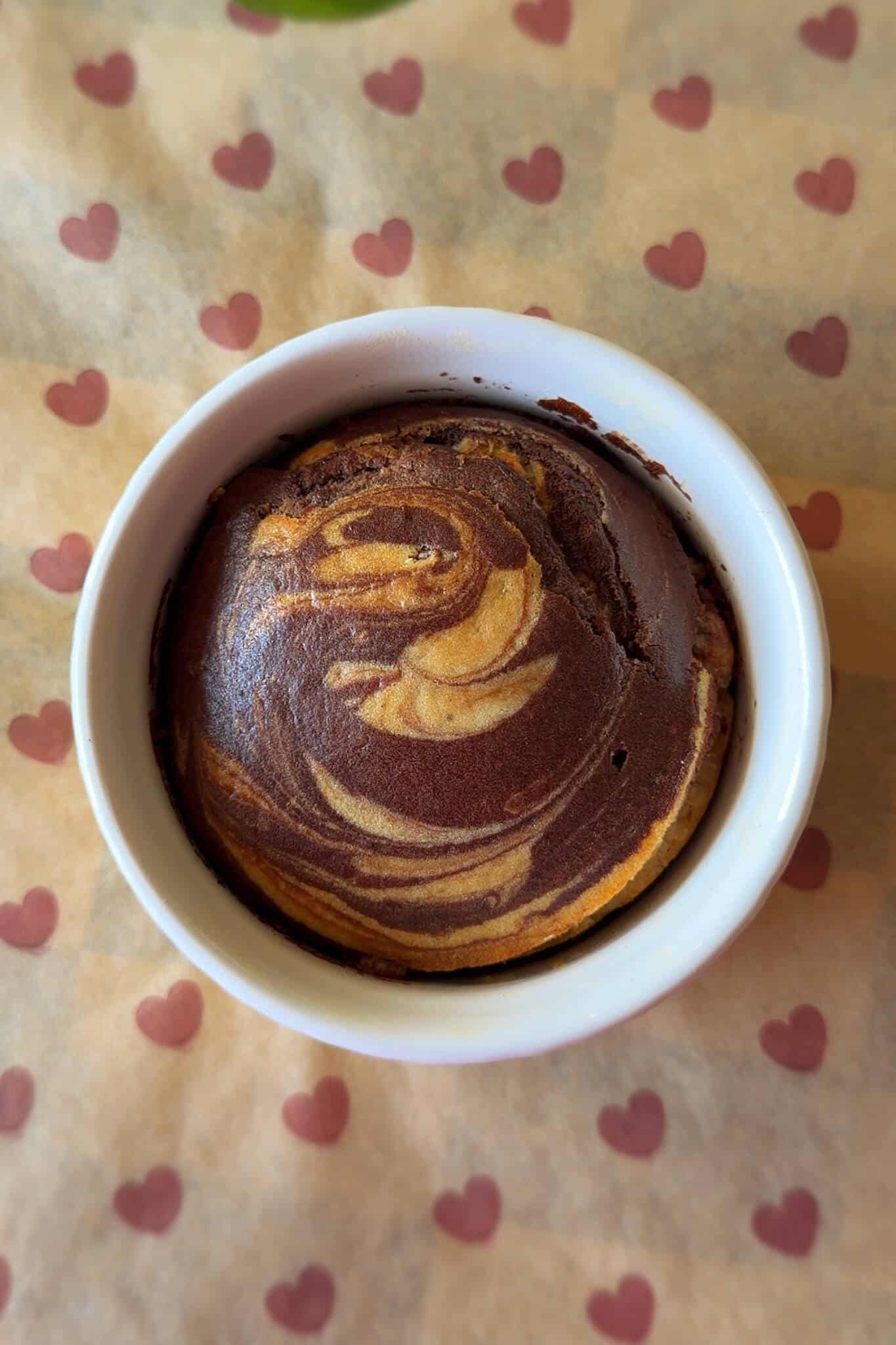- Layer the batters: Grease a small ramekin. Add spoonfuls of vanilla and chocolate batter alternately and swirl gently with a skewer or toothpick to get the marbled effect.