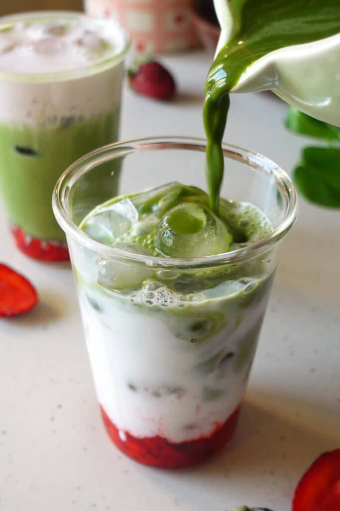 - To assemble, take a glass and add the mashed strawberries. Top with lots of ice, pour in your milk of choice, I used regular cow’s milk, pour over the matcha and finish with the strawberry cream. Your drink is ready, enjoyy!