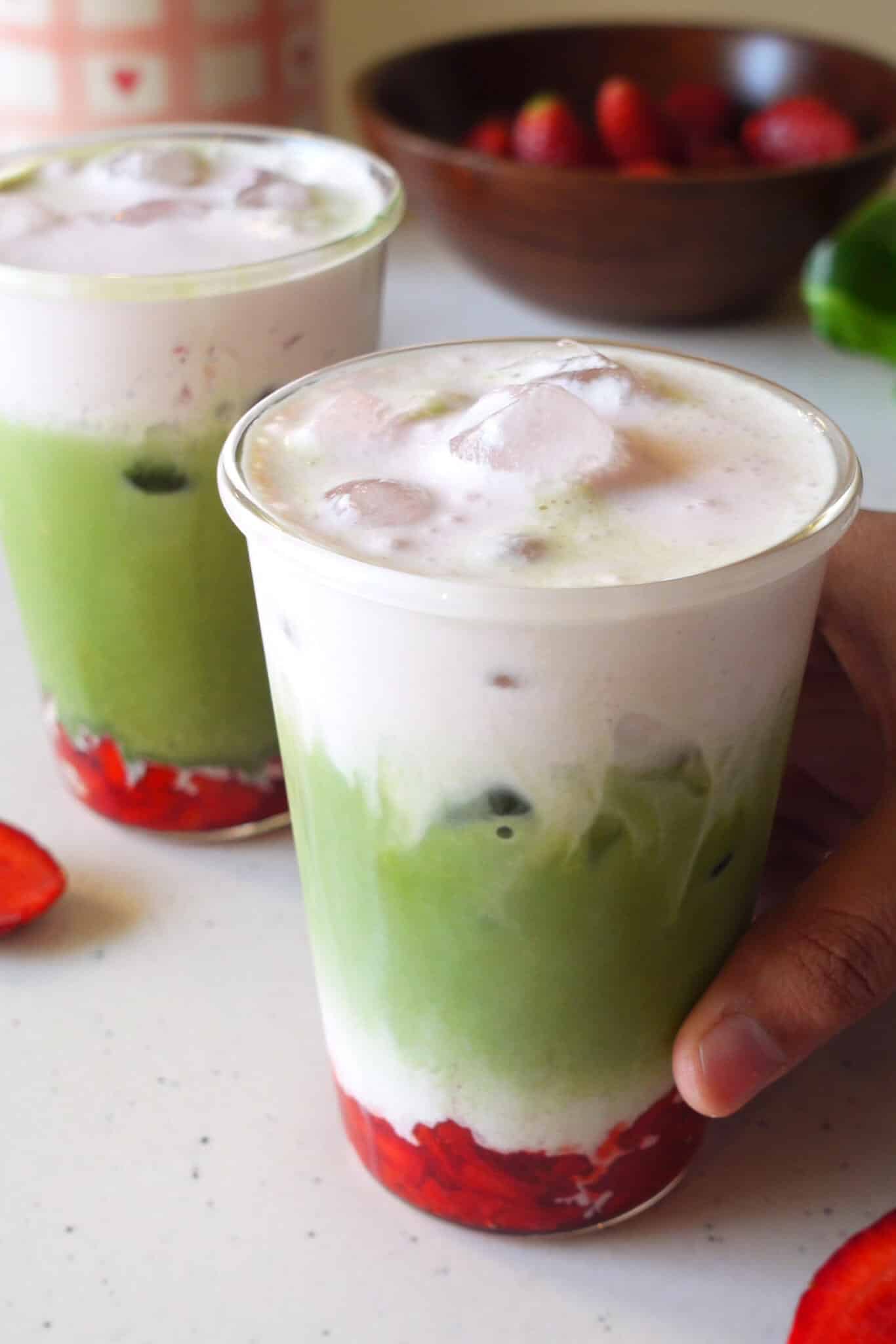 Strawberry matcha is one of those drinks that feels indulgent but still light and fresh and this version brings together everything we all love about it. The mashed strawberries at the bottom add sweetness and a bit of texture, the matcha is whisked properly so it’s smooth and foamy and the strawberry cream on top gives that café style finish without too much effort. Every layer brings a different flavour and it all comes together in the glass: the fresh strawberries, the creamy milk, the earthy matcha and that fluffy strawberry cream. It looks pretty, tastes even better and takes only a few minutes to put together!