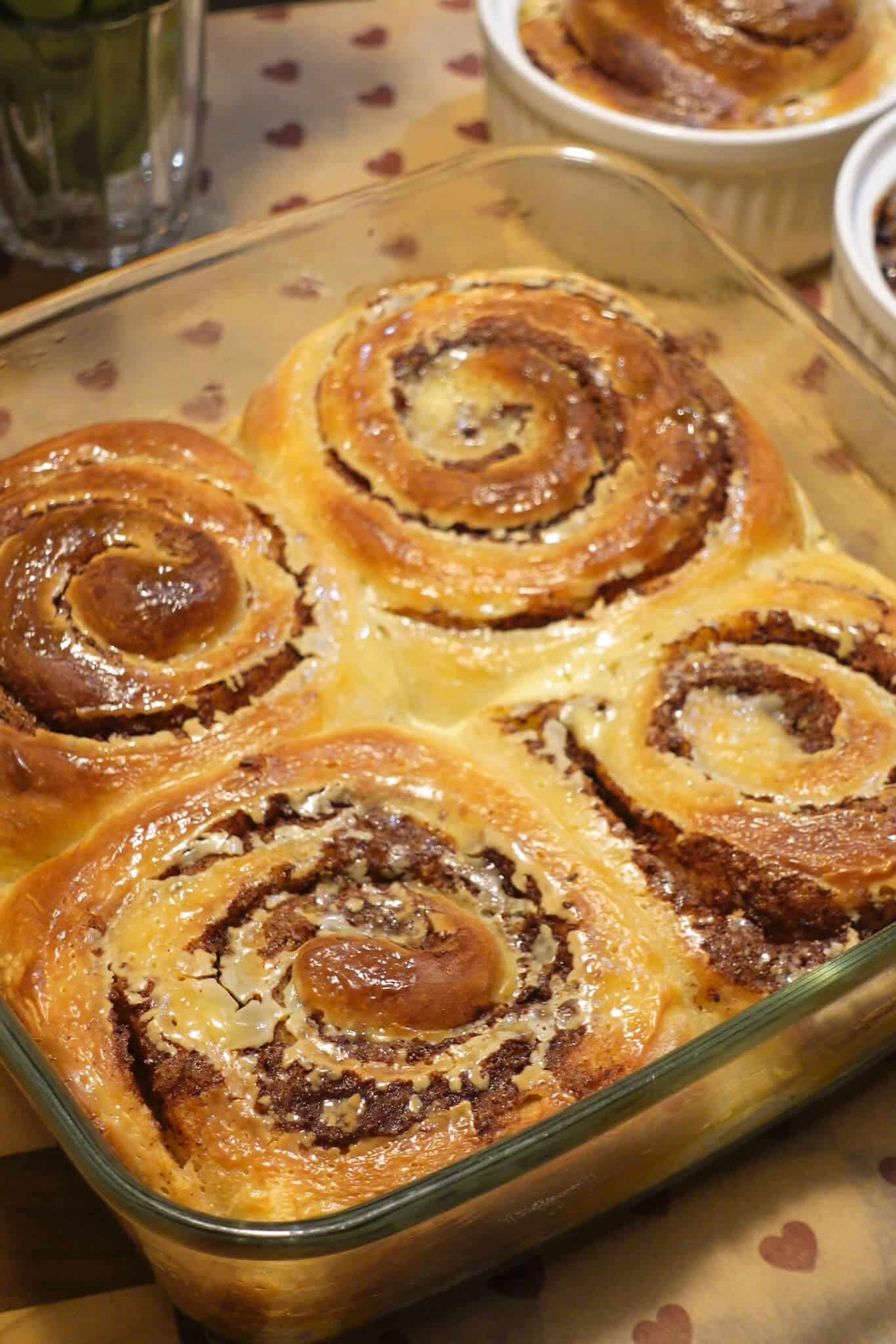 Shape the rolls: Once the dough has doubled, punch it down and place it on a lightly floured clean surface. Roll it into a rectangle, thin but not too thin and spread the cinnamon butter filling evenly across the dough. You can either: