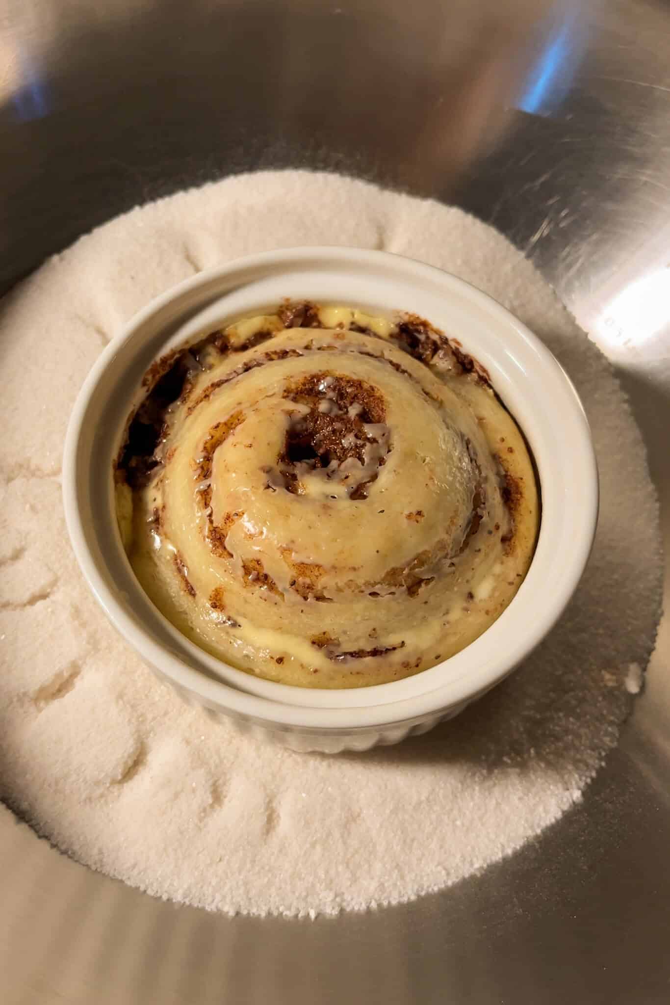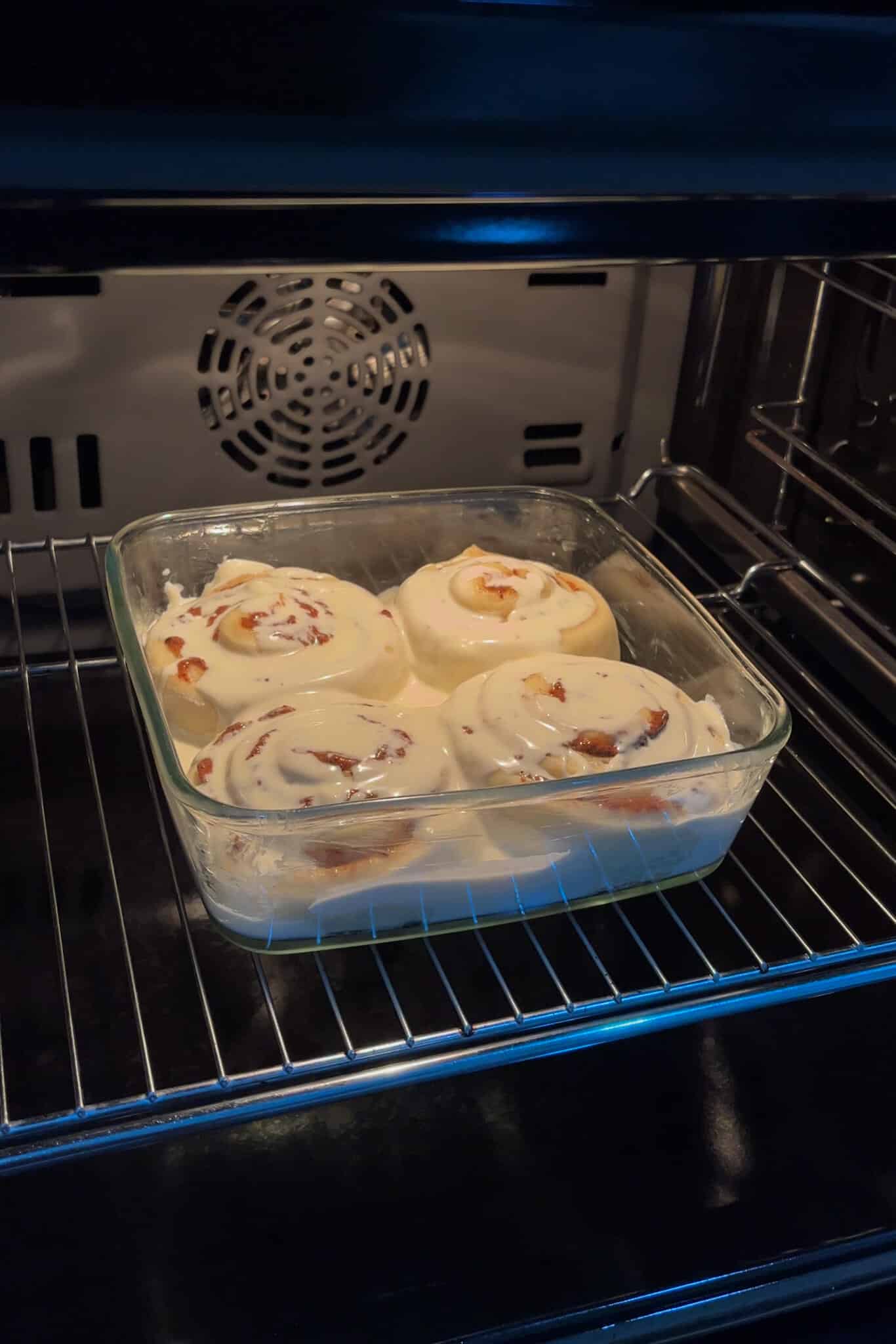 Bake the cinnamon rolls: Once proofed, pour room temperature heavy cream evenly over the rolls. Bake according to your method: