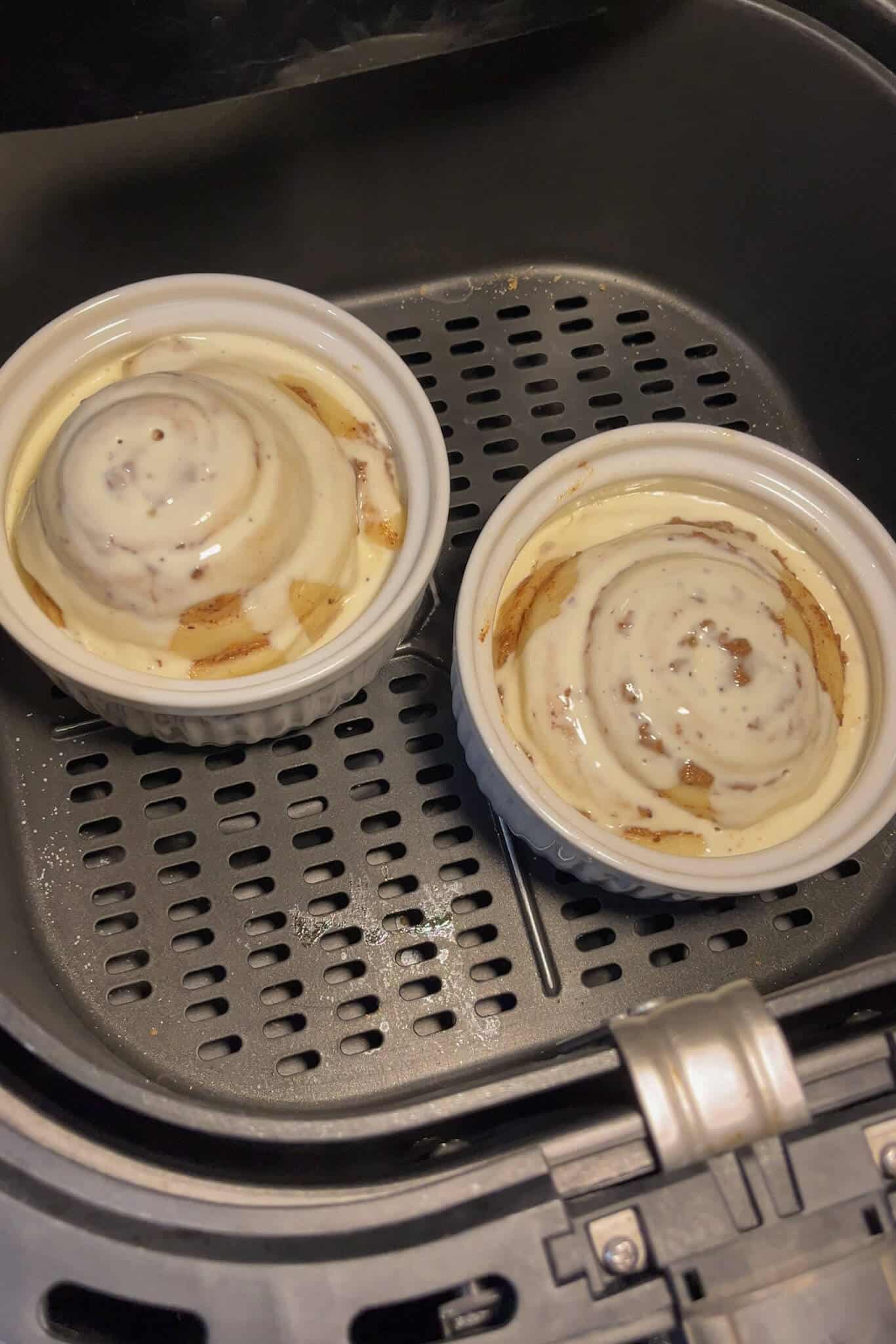 Note: For the oven, you can bake multiple rolls at once in a large rectangular dish (I baked four at a time). In the kadhai or airfryer, I baked them individually in ramekins which shortens the bake time. If you’re baking a larger batch at once in these, increase the cooking time by 5–10 minutes. - Make the glaze: While the rolls bake, prepare the glaze. In a bowl, whisk softened cream cheese, sifted icing sugar, vanilla extract and heavy cream till smooth and creamy. Adjust consistency with more cream if needed.