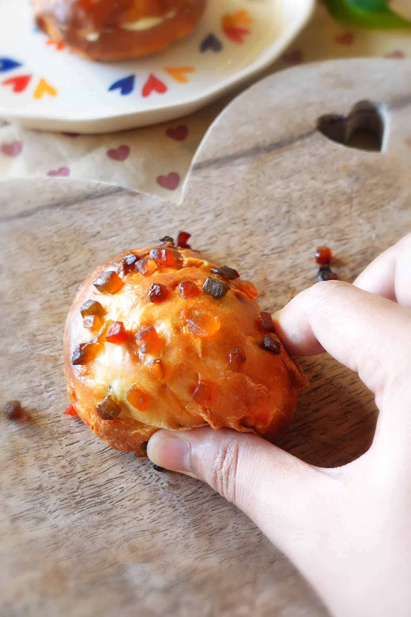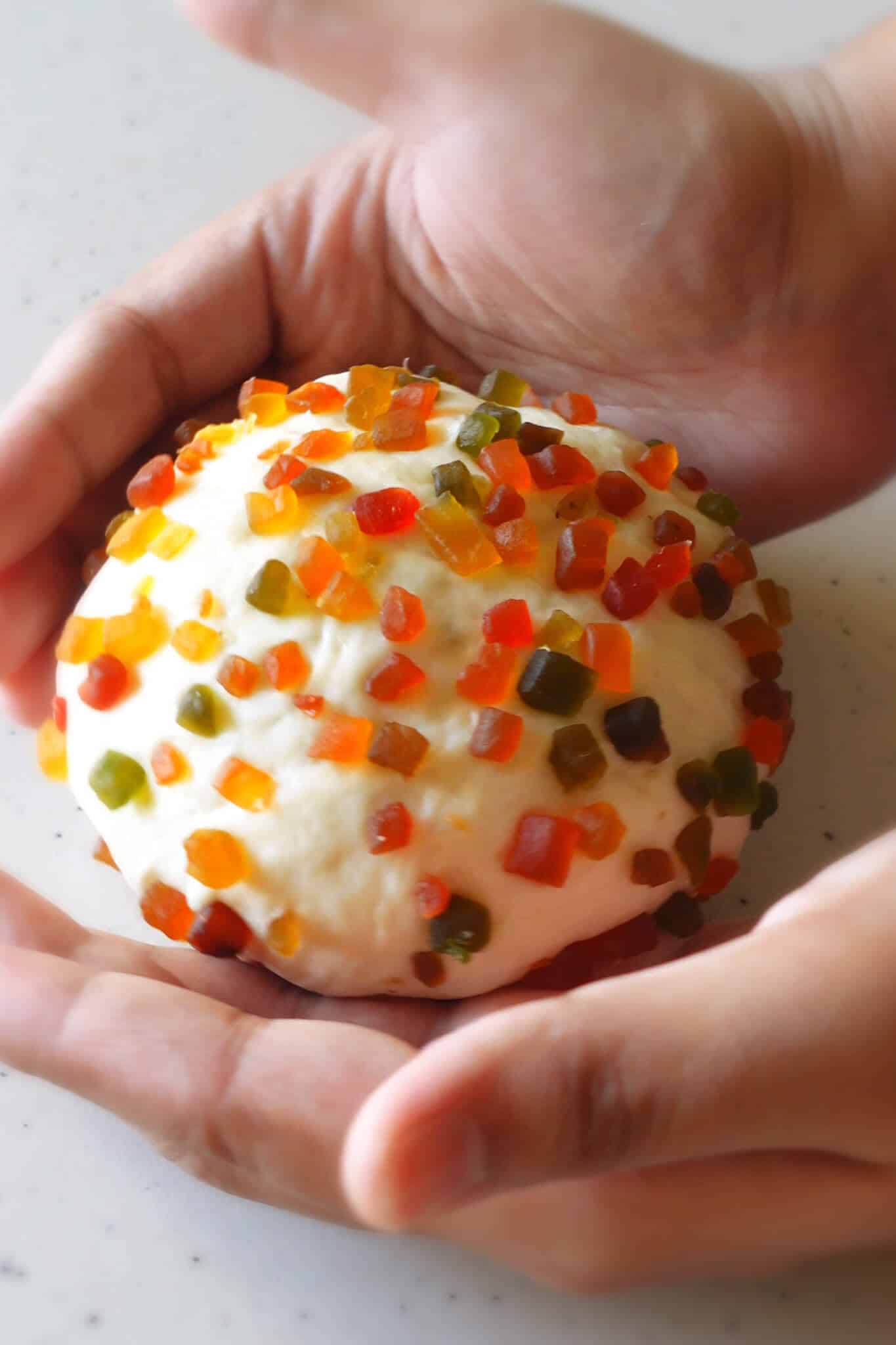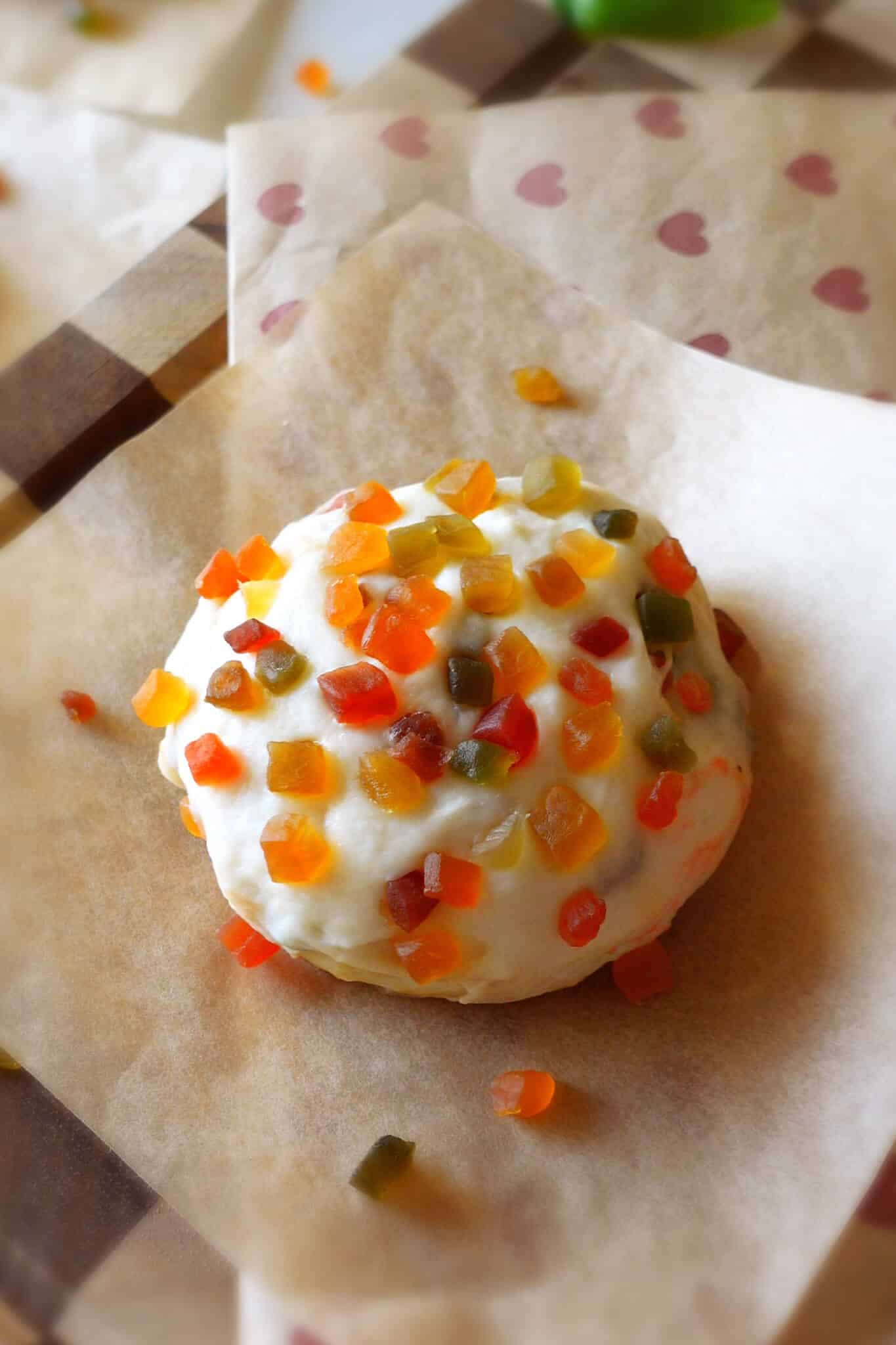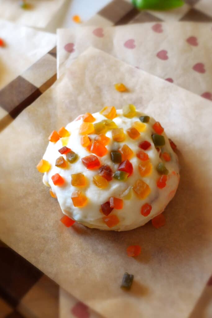 - Add the tutti frutti: Once the dough has doubled, gently punch it down to release the air. Transfer it to a clean work surface and roll it out into a rough square using a rolling pin. Sprinkle the tutti frutti evenly over the dough. Fold the dough over itself a few times and knead lightly for a minute or two until the tutti frutti is evenly distributed throughout the dough.