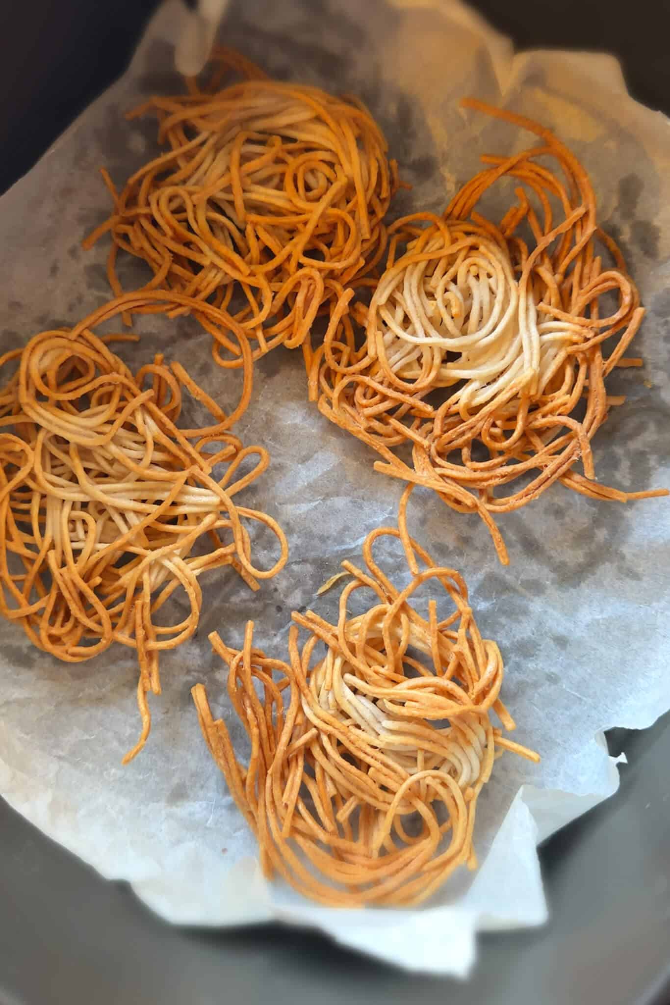 - For the crispy noodles, boil whole wheat noodles until cooked, drain, mix with oil and airfry on parchment at 200°C for 11-13 minutes, flipping midway until crisp. Let cool for 5 minutes, crush and serve on top of the soup.